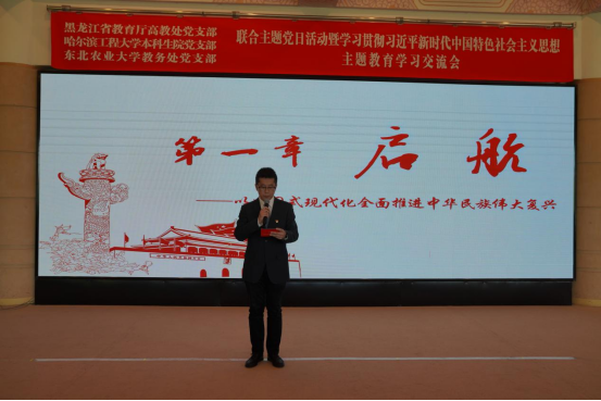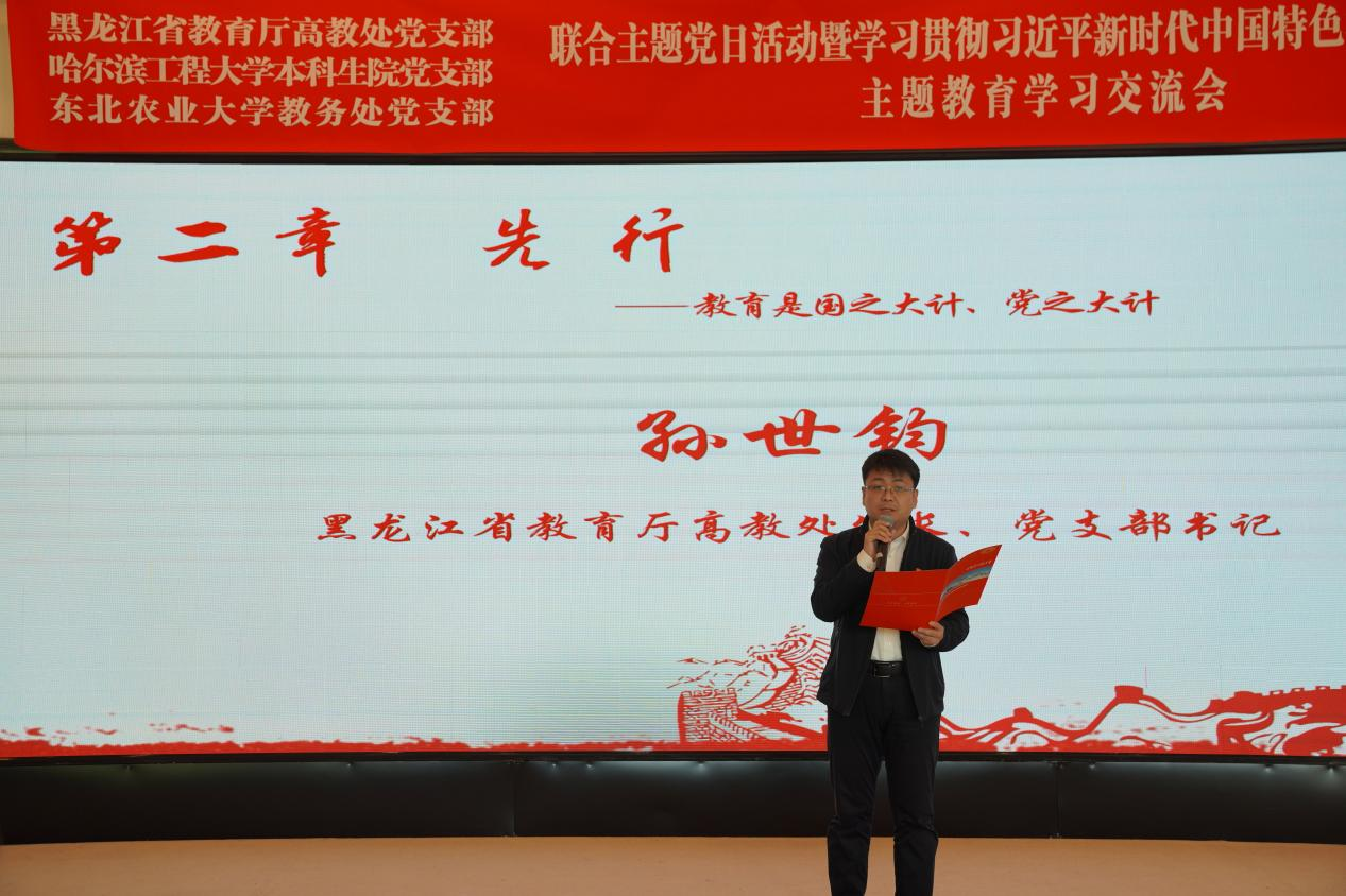 黑龙江省教育厅高教处处长、党支部书记孙世钧以《勇担使命 主动作为——推动龙江高等教育内涵发展、创新发展、特色发展》为题,分享了主题教育的学习体会,同时围绕勇担时代使命、主动担当作为和龙江高等教育三个方面介绍了加快龙江“三个发展”、推动“三个转变”的思路和举措。