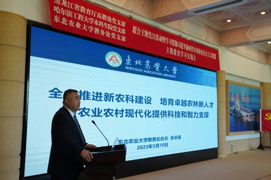 东北农业大学教务处处长、党支部书记张永强以《全力推进新农科建设 培育卓越农林新人才 为农业农村现代化提供科技和智力支撑》为题,围绕新农科建设的立足点、生命力、推进器和动力源等四个方面介绍了东北农业大学在新农科建设中深入思考、创新举措和优质成效。张永强表示,2022年,黑龙江省新农科教育联盟正式成立,这标志着龙江新农科建设已步入新的发展阶段。作为联盟发起单位,东北农业大学一定牢记办学使命和习近平总书记嘱托,主动对标国家战略和龙江经济社会发展需求,奋力推进新农科建设,与各兄弟院校一道为实现农业农村现代化矢志奋斗!