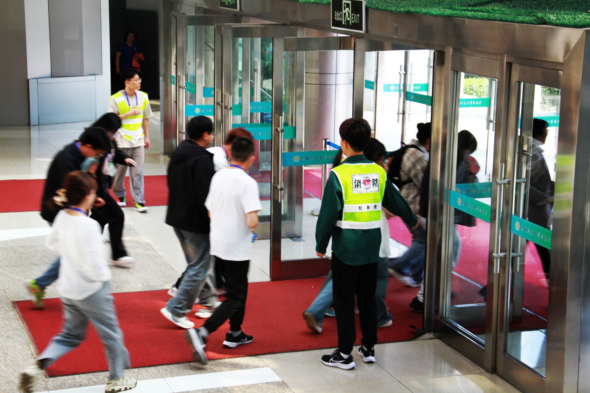 宫建伟对音乐厅应急预案、安全员工作职责及消防逃生疏散流程进行了详细说明。在应急疏散演练环节,随消防广播响起,场外安全员迅速打开各消防通道大门,场内安全员立即到达指定位置疏散引导观众,所有师生从消防通道快速、有序按照规划的逃生路线撤离至安全区域。