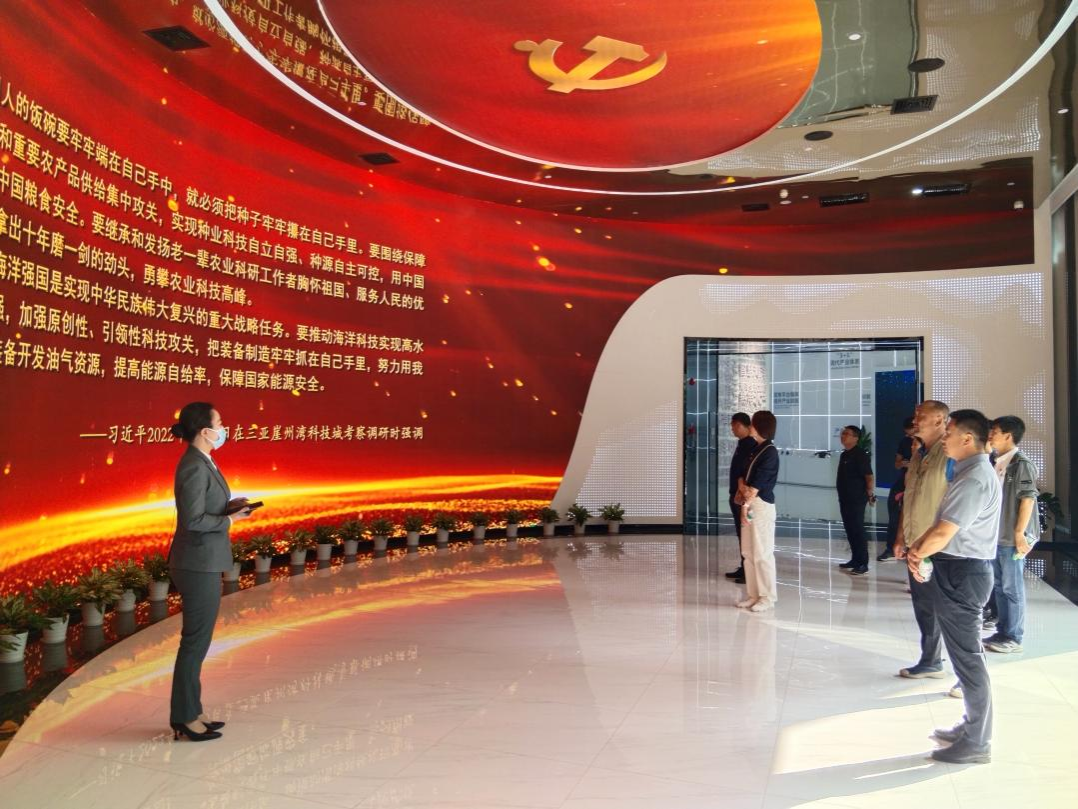 党支部成员参观了产业促进中心展馆中的陆-南繁展厅、海-深海展厅、知识产权-多功能展示厅等中心模块,沉浸式体验科技创新的魅力,生动地感受国家战略发展崖州湾的新篇章、南繁种业的新力量、深海科技产业的新蓝海。
