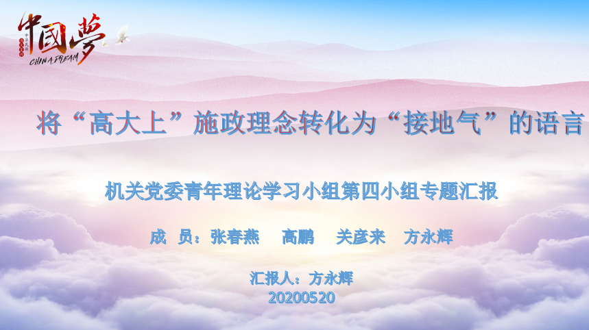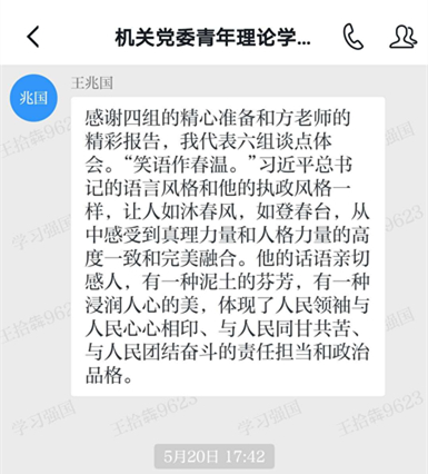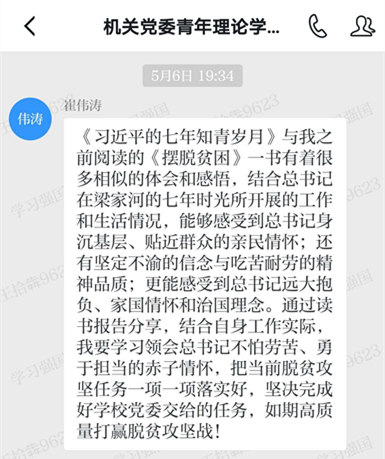 为慎终如始抓好疫情防控常态化各项工作,减少人员聚集,机关党委青年理论学习小组制定了《2020年上学期线上学习方案》,在5月至7月间,每两周开展一次学习分享。各分小组根据《习近平七年知青岁月》《平易近人:习近平的语言力量》《习近平谈“一带一路”》《郑永年论中国:中国的文明复兴》《习近平用典》等书目内容,结合自身学习体会和工作实际,利用PPT与小组成员进行线上交流,进一步丰富了学习形式,提升了学习效果。在交流期间,各分小组认真准备,积极参与。有的小组全员分享读书体会,有的成员利用视频进行生动展示,有的成员克服在外扶贫的艰苦条件,认真参与每次学习分享。在全体成员的共同努力下,学习小组顺利完成上半年学习计划。