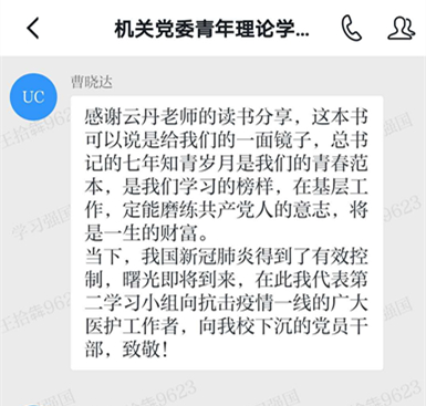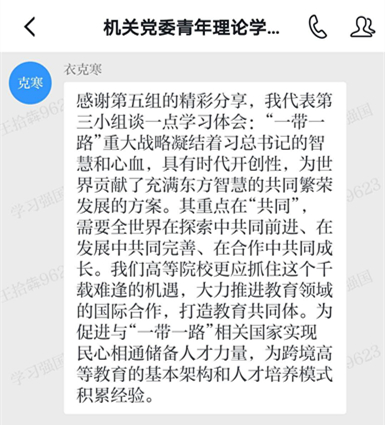 据悉,为增强理论学习的吸引力和感染力,调动小组成员的积极性和主动性,机关党委青年理论学习小组在“学习强国”学习平台建立了交流群。小组成员在每次集体学习后进行心得分享,取得了良好的交流效果。目前,学习小组已为成员购买了新的阅读书籍,小组成员将根据组织部2020年度培训相关工作要求,撰写阅读心得并汇编成册,进一步用理论知识武装头脑,指导实践,在学思践悟中坚定理想信念,在奋发有为中践行初心使命,为学校“世界一流学科”和高水平大学建设做出新的更大的贡献。